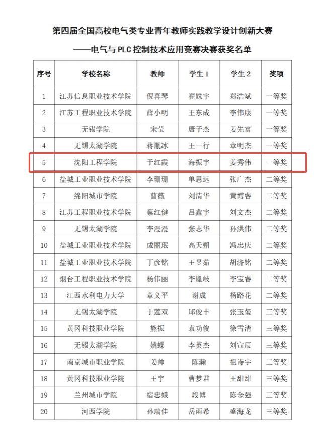 我院于红霞老师与团队成员海振宇、姜秀伟同学凭借出色的表现,在第四届全国高校电气类专业青年教师实践教学设计创新大赛-电气与 PLC 控制技术应用竞赛决赛获国家级一等奖。