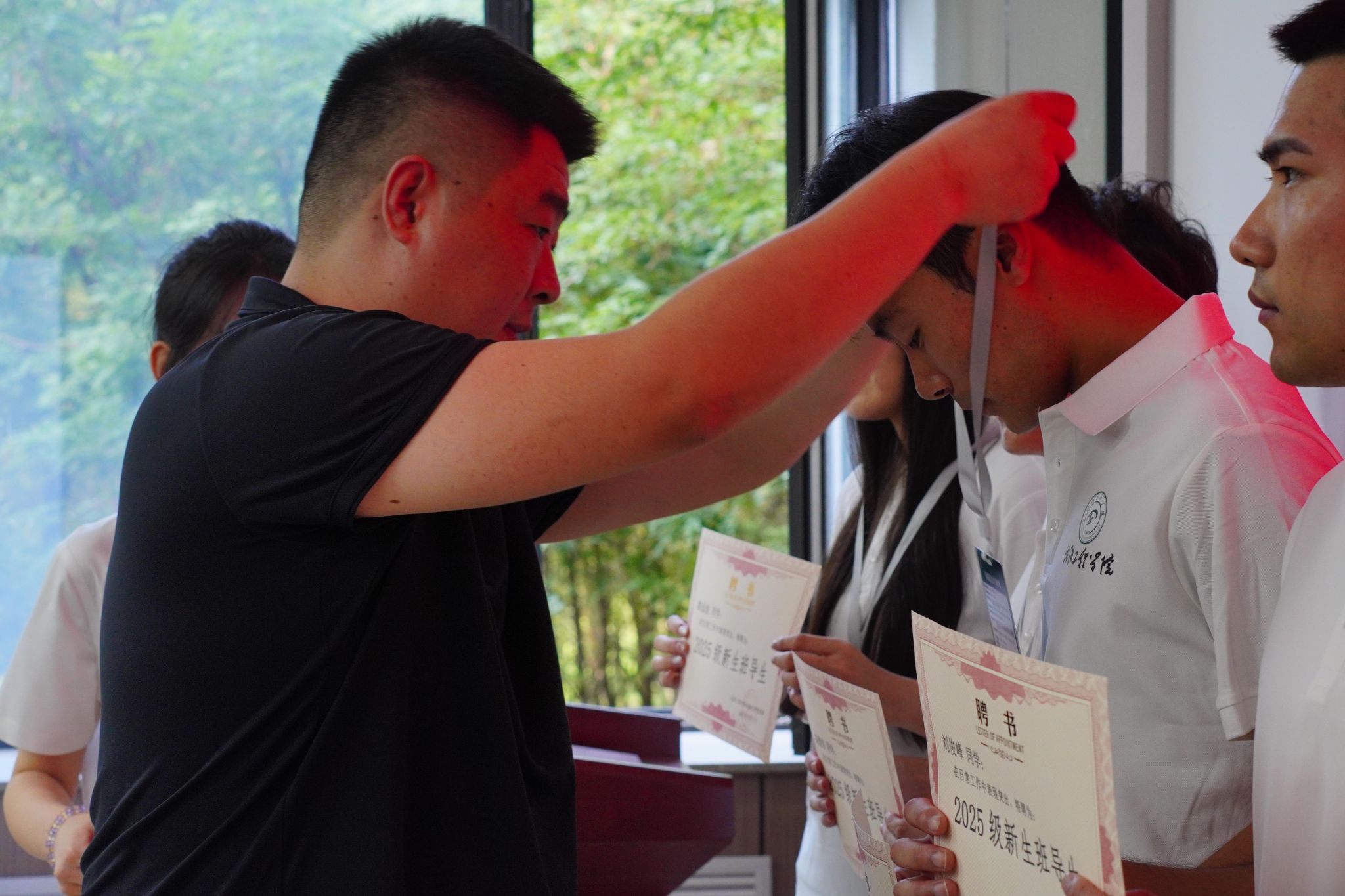 会议在热烈的掌声中开始,现场庄严又温暖。新生班辅导员杨乘一老师率先发言,他用充满激情的话语承诺,将全力以赴做好万全准备,确保新生享受贴心、顺畅的入学体验。其后,导生代表、学生会主席团成员贾子健宣读了2025级班导生名单。随后举行的聘任仪式上,新生班辅导员老师为导生们颁发了聘书和专属服装,象征着这支骨干队伍正式亮相,肩负起新身份赋予的责任。